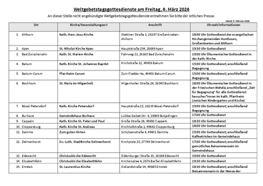 - Jever (Bethaus der Baptisten, 17:00 Uhr): Ökumenischer Gottesdienst mit gemeinsamem Imbiss